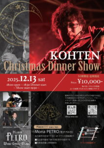 ※SOLD OUT‼KOHTEN Christmas Dinner Show この記事のタイトルとURLをコピーする 開催日: 2025年12月13日 6:00 PM - 10:00 PMカテゴリー: ライブ KOHTEN(Vn,Sax) Tomomi Ito(Gt) コルゲン(Per) OPEN 18:00 DINNER 18:30 LIVE 19:30 MC ¥10,000- (ディナーコース付き) Tweet Share Hatena Pocket RSS feedly Pin it 昭和100年度 さよなら・ふたり紅白歌合戦(最終回) 前の記事 LIVE 次の記事