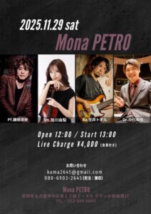 MonaPETRO Live この記事のタイトルとURLをコピーする 開催日: 2025年11月29日 12:00 PM - 3:00 PMカテゴリー: ライブ 鎌田浩史(Pf) 加川由梨(Vn) 笠井トオル(B) 小川和也(Dr) OPEN 12:00 START 13:00 MC ¥4,000- ランチ付き Tweet Share Hatena Pocket RSS feedly Pin it Music polodance 前の記事 ※SOLD OUT‼3rd Place 次の記事